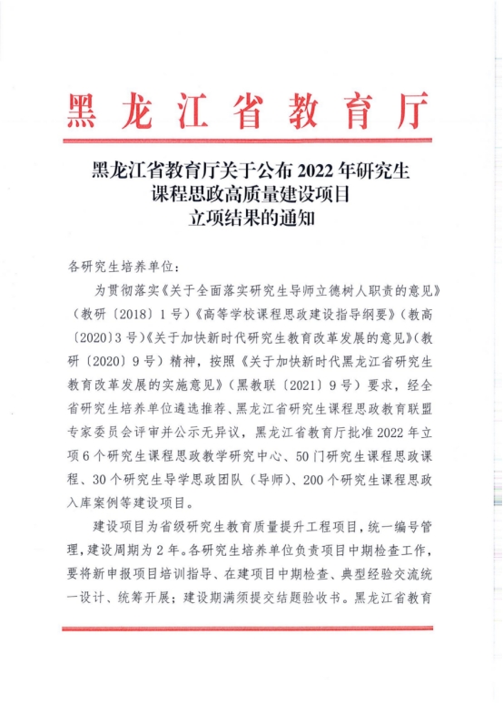 近日,黑龙江省教育厅印发《黑龙江省教育厅关于公布2022年研究生课程思政高质量建设项目立项结果的通知》。我校3个研究生导学思政团队、5门研究生课程思政课程和11项研究生课程思政案例获准立项建设。