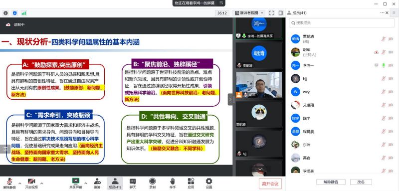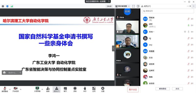 为了及时准确掌握国家自然科学基金的申报政策、提高青年教师科研项目的申报质量和命中率、助力学院学科建设和持续发展,2022年11月2日上午,应自动化学院邀请并在科技处的支持下,广东工业大学博士生导师、国家高层次人才特殊支持计划科技创新领军人才、国家优秀青年科学基金获得者、教育部新世纪优秀人才李鸿一教授作了题为“国家自然科学基金申请书撰写方面的一些亲身体会”的报告。报告由胡军教授主持,自动化学院李东洁副院长、自动化学院及相关学院青年教师等40余人在线参会。