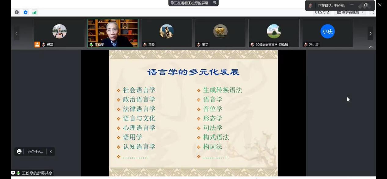为开阔师生学术视野,促进与国内外知名专家学者的学术交流与合作,推动学科建设与发展,外国语学院邀请信息工程大学王松亭教授作题为《语言学研究:历史、现状与发展前景》的学术讲座。讲座于11月2日19时准时开始,学院副院长杨蕊主持讲座。