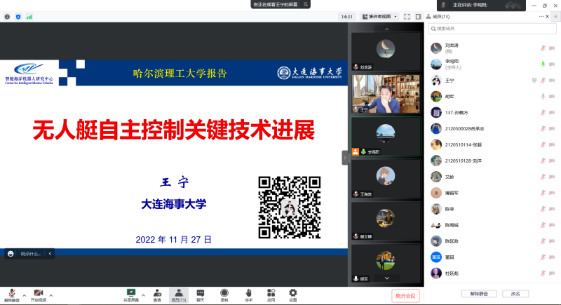 为了加强院校间的学术交流合作,提高我院师生的科研能力和创新水平,应自动化学院邀请,2022年11月27日,国家高层次人才计划青年拔尖人才、全球高被引科学家、大连海事大学王宁教授作了题为“无人艇自主控制关键技术进展”的学术报告,本次报告为2022年度自动化学院“智能控制及其应用国际前沿学术研讨会”第11场学术报告。报告会由李鸣阳博士主持,自动化学院院长胡军教授、相关学院教师以及硕博研究生等90余人在线参会。