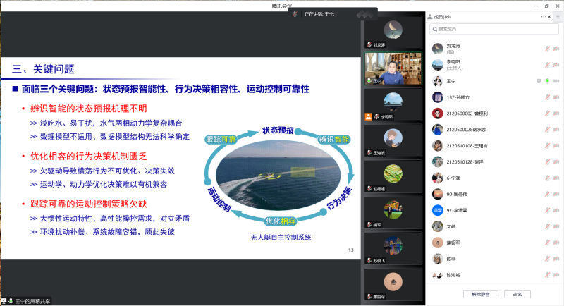 报告会上,王宁教授指出无人艇在军事和民用领域都具有重大战略需求和广阔应用前景,自主控制技术是支撑无人艇作业作战自主性的核心关键,近年来得到了世界各海洋强国的高度关注,尤其在环境感知、规划决策、航行控制等方面,系列关键技术持续突破、快速发展,明显提升了无人艇的自主性水平,有力推动无人艇的军事化、实用化进程。随后,王宁教授聚焦于无人艇自主控制技术研究,从需求背景、发展现状、关键技术、创新贡献、趋势展望等方面进行了系统性汇报。