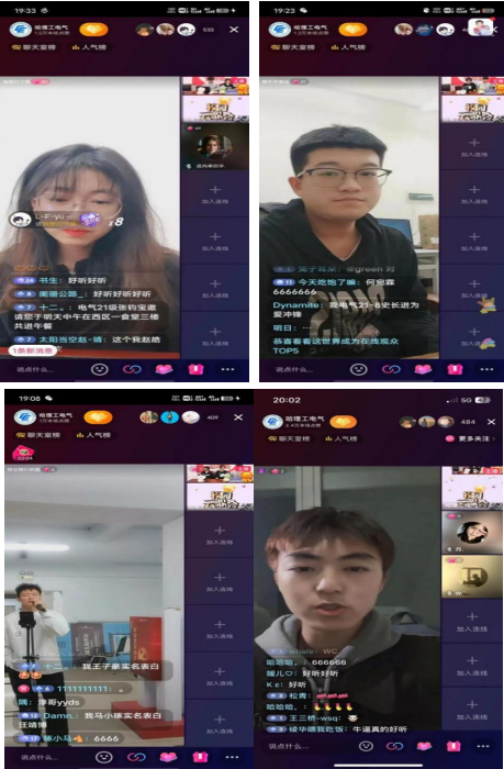 各学院参加云歌会的同学们在宿舍、在实验室、在体育场、在教学楼等校园的每处温馨角落连麦演唱,吉他协会的同学们在直播间现场表演。在直播过程中,兄弟院校的老师同学们也发来实时关注,主持人在直播现场连麦了哈尔滨师范大学的观众同学,将直播氛围再一次推向热潮。