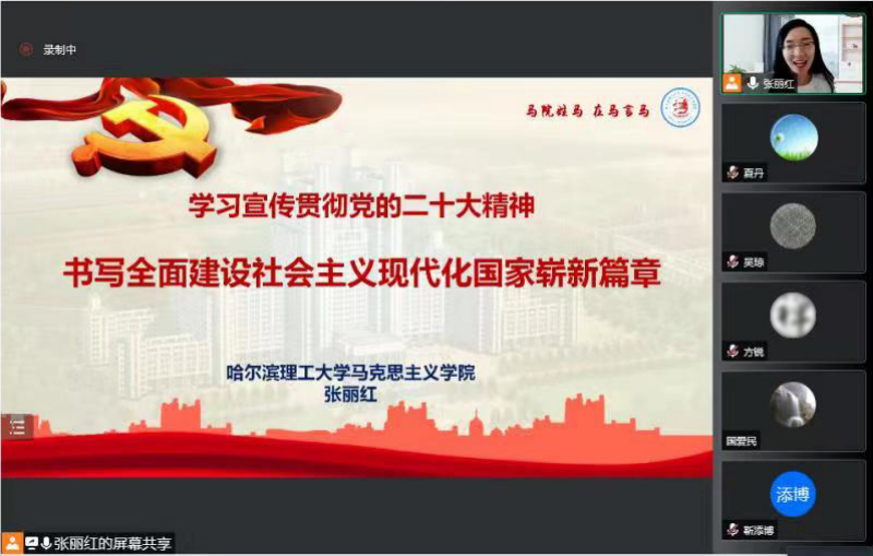 张丽红老师本次宣讲的主题是《学习宣传贯彻党的二十大精神书写全面建设社会主义现代化国家崭新篇章》。图书馆党支部书记、副馆长靳添博主持会议,馆长初田辉发表讲话,图书馆全体工作人员以线上会议的形式参加宣讲报告会。