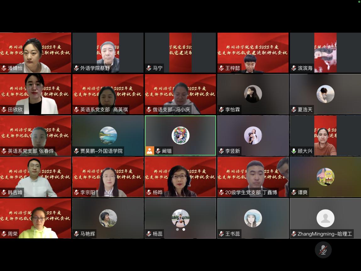 为坚持和加强党的全面领导,夯实学院党建工作,落实管党治党政治责任,进一步推进党支部标准化、规范化建设,12月8日晚,外国语学院党委通过腾讯会议线上方式,开展2022年度党支部书记抓基层党建工作述职评议考核。学院党委书记顾大兴、副书记蔡野、副院长杨蕊出席会议,院长马艳辉、副院长王书蕊列席会议。全体党委委员、专职组织员、党支部书记、党支部委员代表、党员代表参会。