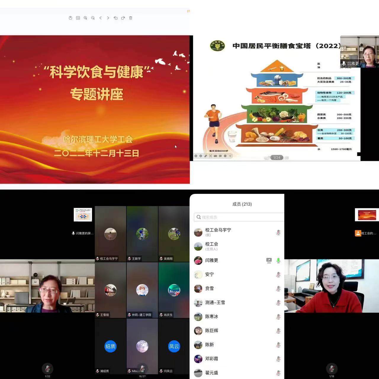 12月13日,校工会邀请哈尔滨医科大学附属第一医院临床营养科主任医师闫雅更,为我校教职工带来了一场以“科学饮食与健康”为主题的线上知识讲座。校工会副主席王立明主持讲座,学校各级专兼职工会干部、教代会和工代会代表以及关注饮食与健康的200余名教职工线上聆听了讲座。