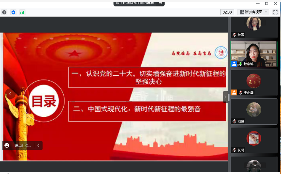 为深入学习贯彻党的二十大精神,按照学校党委、宣统部《关于在全校范围内开展党的二十大精神宣讲工作的通知》精神及相关要求,测通学院对接并邀请校宣讲团成员、马克思主义学院孙宇博老师,以“学习宣传贯彻党的二十大精神,书写全面建设社会主义现代化国家崭新篇章”为题,于12月13日晚19:00通过线上向测通学院师生开展宣讲。此次党课由测通学院党委副书记张宏磊主持,测通学院领导班子、各系部主任、全体教师党员、全体辅导员及学生党支书书记、学生代表参加本次活动。
