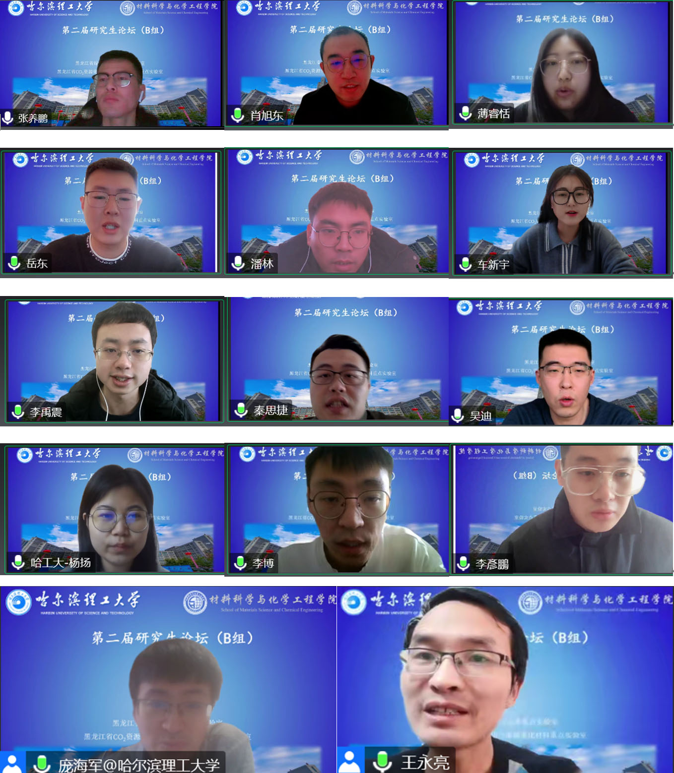 开幕式结束后,“金属与结构材料”和“有机/无机功能材料与化学”两个分会场同时开始了学术报告交流,由冯义成教授、胡茂良教授、庞海军教授和王永亮教授分组分段主持。经过前期充分准备,论坛学术委员会遴选了学院23个博士和硕士的优秀报告,同时邀请了哈尔滨工业大学、哈尔滨工程大学、黑龙江大学相近学科的10名优秀博士、硕士研究生为论坛做交流报告。本次论坛的主题是“务实创新 立足基础 跟踪前沿”,旨在贯彻习近平总书记关于研究生教育工作的重要指示精神和党的教育方针,落实立德树人根本任务,提升研究生教育质量,增强研究生学术氛围,促进研究生群体间的学术交流。来自我校材化学院、哈尔滨工业大学、哈尔滨工程大学和黑龙江大学共计400余名师生参加了论坛交流,线上会场气氛热烈,学术氛围浓郁,研究生们踊跃交流,点评专家点拨恰如其分。