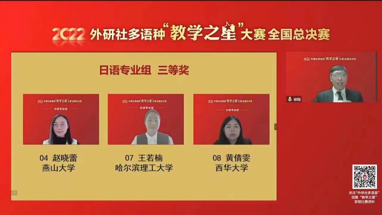 12月20日,2022外研社多语种“教学之星”大赛全国总决赛云端开赛,经过激烈角逐,我校外国语学院日语系教师王若楠获得本次大赛日语专业组三等奖。