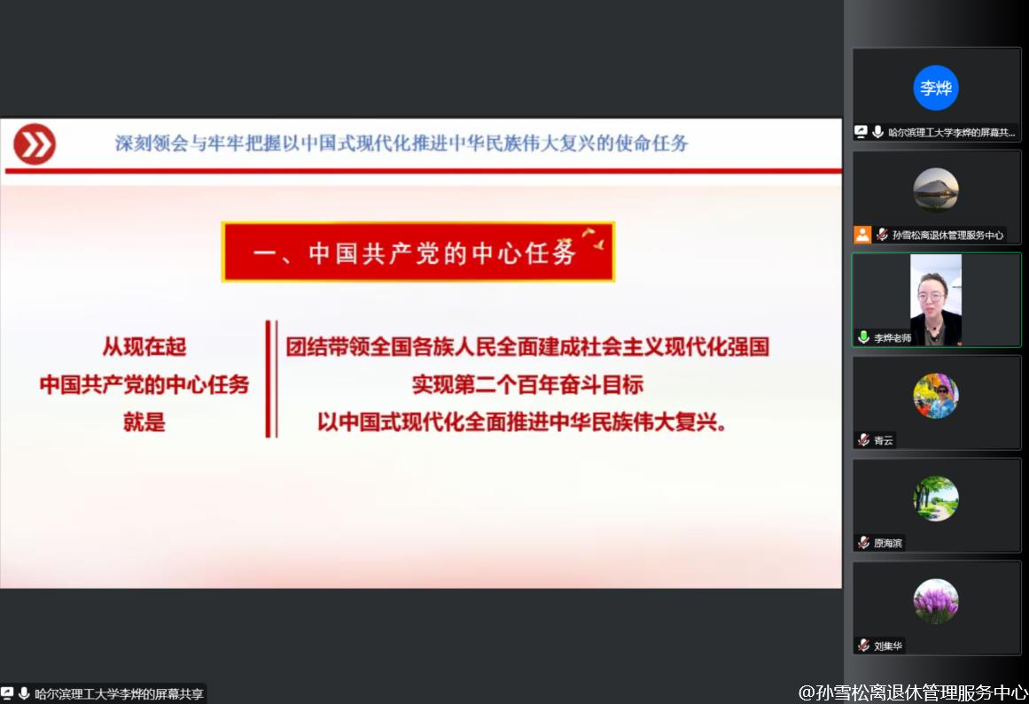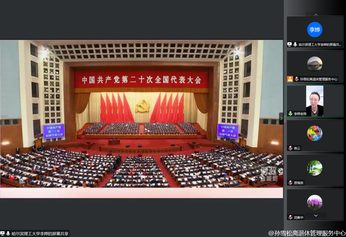 党的二十大是一次高举旗帜,凝聚力量,团结奋进的大会,取得了丰硕的政治成果、实践成果、理论成果、战略成果、制度成果,在党和国家事业发展进程中具有极其重大的历史意义。学深悟透党的二十大精神的精髓要义,对于我们党员同志来说尤为重要。为进一步深入学习党的二十大精神,12月19日上午,离退休党委邀请党的二十大精神学校宣讲团成员、马克思主义学院马克思主义基本原理教研室教师李烨通过视频方式为全体工作人员、离退休各党部书记、“五老”宣讲团成员和党员代表作党的二十大精神专题宣讲。
