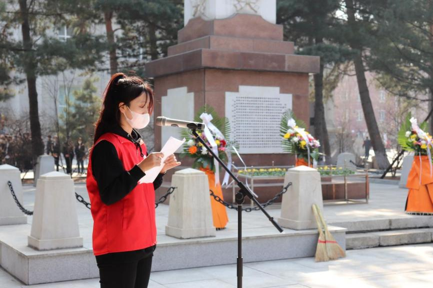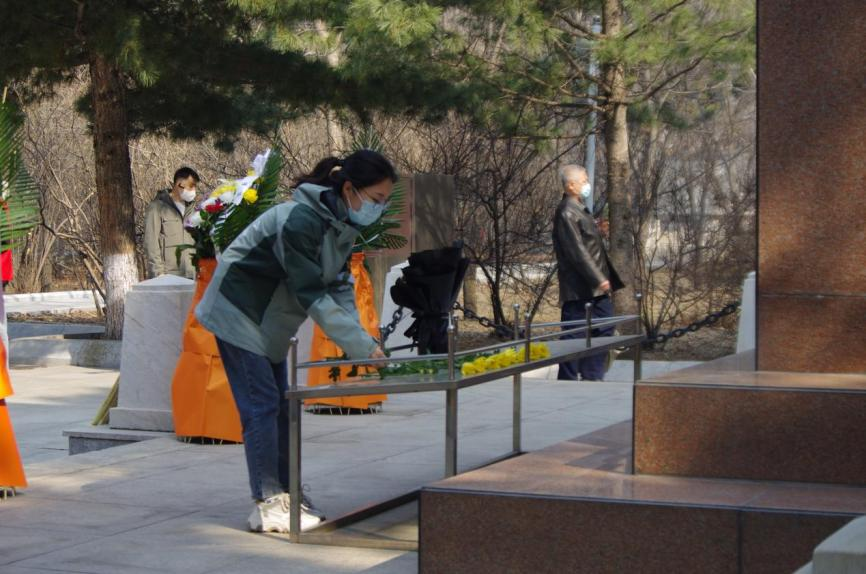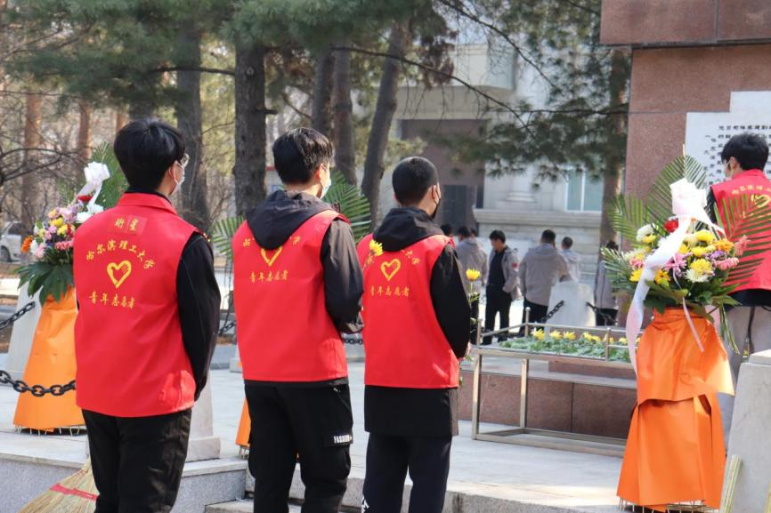 4月2日清晨,“珩星”志愿服务队的40多名志愿者们穿着整洁,队列整齐,来到老校长王大珩先生的雕像前,敬献菊花并深深三鞠躬以表示深切缅怀。志愿者们带着深沉的哀思和无尽的怀念,精心地清扫王大珩雕像及其周围场地。随后志愿者们前往哈尔滨烈士陵园,陵园庄重而肃穆,主持人怀着沉重的心情向革命先烈致以最崇高的敬意。当铿锵的国歌响起,志愿者们面对着五星红旗,全程肃立,奏唱中华人民共和国国歌,那些慷慨激昂的歌词记录的是曾经英烈们英勇斗争的历程,承载着无数不朽的历史与信念,歌声嘹亮响彻整座陵园。以山为灵,以木为魂,全体志愿者向烈士们献上菊花,送上问安,致敬英雄。朵朵菊花,象征着他们心灵的纯净无瑕,象征着他们崇高的品质和无私的精神。缕缕春风,说不及对革命烈士的无限深情,道不尽对烈士英魂的无尽哀思。全体志愿者怀着深切悼念和无限哀思闭眼默哀三分钟,追忆烈士们为如今繁荣祖国做出的不朽贡献。在这三分钟的沉寂中,时间也仿佛凝滞为永恒,整个陵园能感受到的唯有同学们流动着的哀思与跳动着的爱国热情。默哀结束后,由校团委学生志愿服务中心代表与研究生支教团代表进行发言,表达对烈士们的敬意与怀念,也表达作为新时代青年对未来的决心与信念,青山埋藏着忠骨,烈士们的丰功伟绩将永存史册。崇尚英雄才能产生英雄,争做英雄才能英雄辈出。志愿者全体举起右手面对着团旗,跟随着领誓人庄严宣读入团誓词,声如洪钟,铿锵有力的誓词回荡在整个烈士陵园。最后青年志愿者们分头对陵园全域进行卫生服务,清理可见垃圾,对烈士墓碑进行扫尘、擦拭。