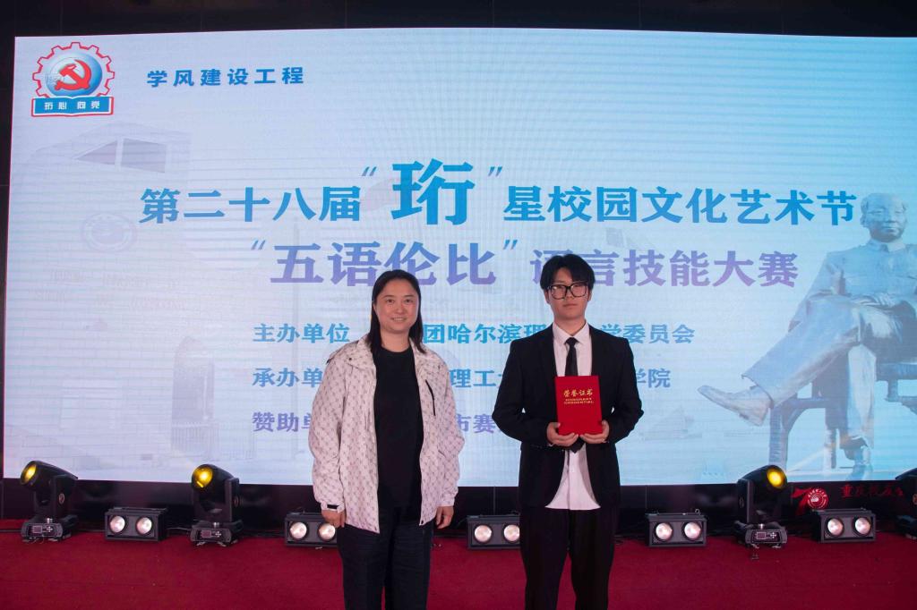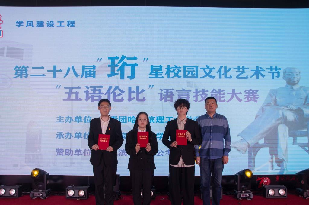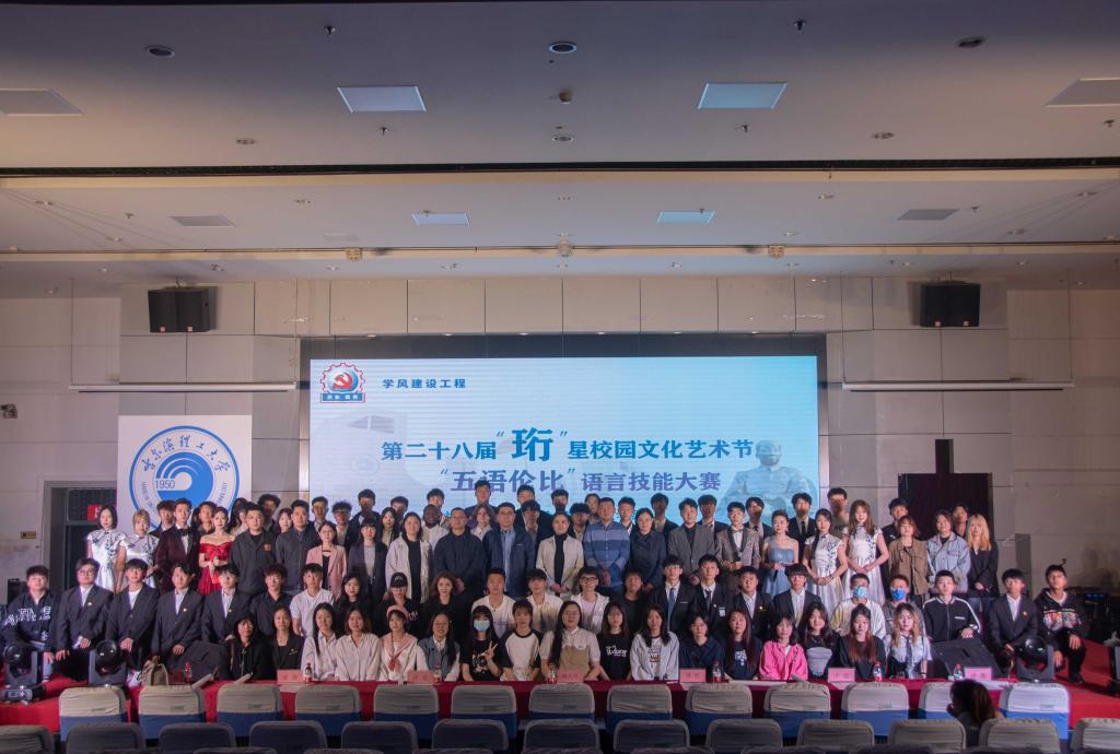 为学习弘扬党的二十大精神,扎实推进习近平新时代中国特色社会主义思想主题教育,贯彻落实学校“珩心向党”党建品牌建设工作,进一步增强青年学生的思想和价值引领、拓宽学生国际视野、提升学生的语言应用能力和国际传播能力,5月12日18时,外国语学院团委、学生会在哈理工西区1号楼0220报告厅成功举办了第28届大学生文化艺术节暨“五语伦比”语言技能大赛。外国语学院党委书记顾大兴、党委副书记蔡野出席本次大赛;外国语学院团委书记马宁老师、英语系徐丹老师、日语系周广老师、俄语系徐玉伟老师、哈尔滨哈普电器技术有限责任公司外贸销售经理张皓维担任本次大赛的评委;外国语学院辅导员贾昊鹏老师为本次大赛组织指导教师。
