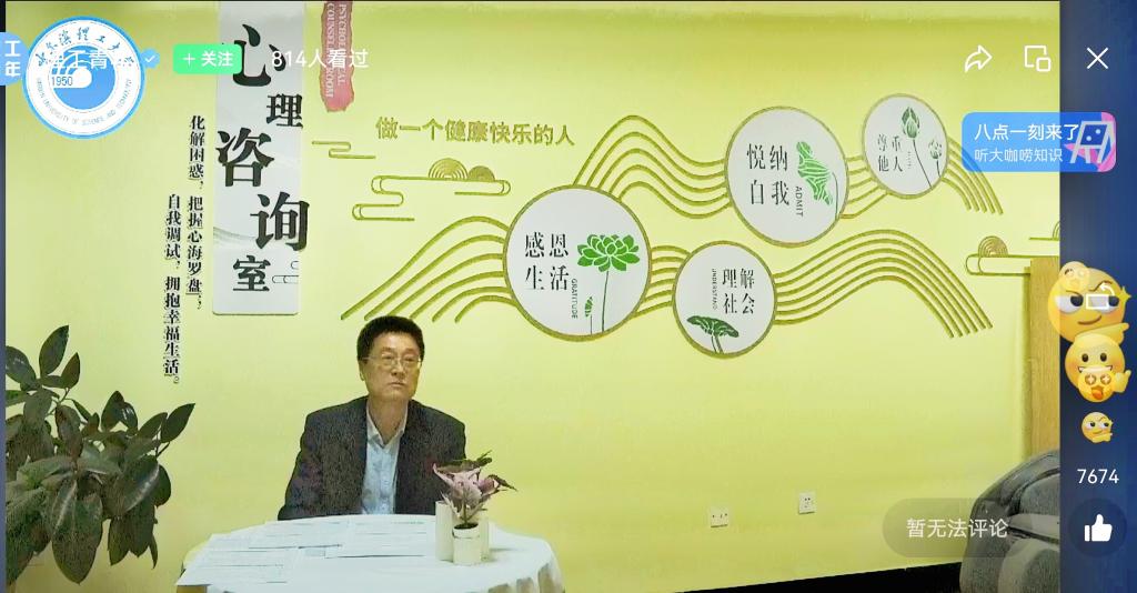 为积极响应以“以心相伴、青春护航”为主题的第十七届5·25心理健康教育活动,进一步加强我校心理健康教育工作,全面构建家校协同育人机制,强化学生心理健康教育的全员参与意识,我校于5月19日18时举办了主题为“从调整‘人生脚本’入手——有效能地做好大学生思想政治教育工作”的主题讲座。讲座面向学生家长,通过理工青年微信公众号在线直播。讲座邀请哈尔滨理工大学心理健康教育中心张泰复教授为主讲嘉宾。直播共计810余人观看,获得7600余次点赞。