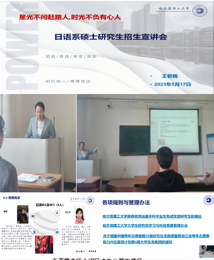 日语系副主任王若楠主持本次会议,首先就日语系学硕和专硕两个授权点的发展历程、招生情况、导师团队、专业特色、学生培养及就业情况等方面进行了详细介绍,欢迎学生们一志愿报考母校。