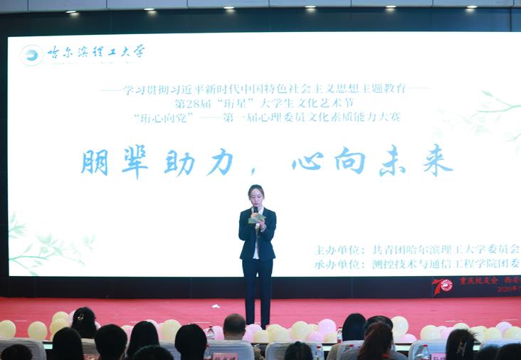 为扎实推进学习贯彻习近平新时代中国特色社会主义思想主题教育,深入贯彻落实习近平总书记关于学生心理健康教育的系列重要指示批示,进一步打造“珩心向党”党建品牌,持续夯实“心理育人”工作成效,不断提高全校心理委员的工作素质能力,营造良好校园文化氛围,5月18日18时,由校团委主办,测通学院团委承办的哈尔滨理工大学第28届“珩星”大学生文化艺术节暨“珩心向党—朋辈助力,心向未来”第一届心理委员文化素质能力大赛在西区1号楼0220报告厅举行,并通过“理工青年”视频号同步进行直播。校团委书记韩彧博,校党委组织部副部长乔林,测通学院党委书记黄春丽,党委副书记张宏磊,副院长盖建新、孙晓明,理学院党委副书记宋广军,机械学院党委副书记杨芳,自动化学院党委副书记艾荻等作为嘉宾到现场与师生共同观看。校心理健康教育中心吕彬江老师、赵旋老师、韩雨希老师受邀担任本次心理委员文化素质能力大赛决赛评委。