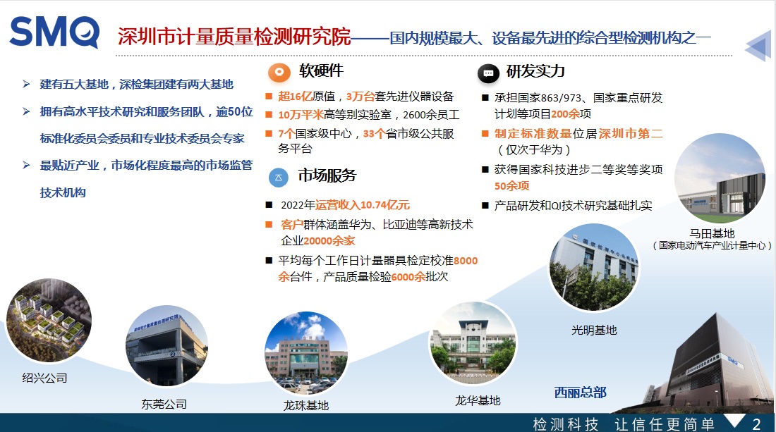 深圳市计量质量检测研究院是由深圳市人民政府设立,经国家市场监督管理总局授权的法定计量检定和产品质量检验认证机构,为企业提供仪器设备检定校准、产品测试、产品认证、供应链品质保证检测和技术咨询与培训等技术服务,承担国家863/973和国家重点研发计划等国家级项目31项,承担国家发改委、广东省科技项目等省部级项目84项,承担市厅级项目116项,已经发布的标准、规程规范608项,累计获得包括国家科技进步二等奖在内的各类国家、省、市级以上奖项80余项,是国内规模最大、设备最先进的综合型检测机构之一。