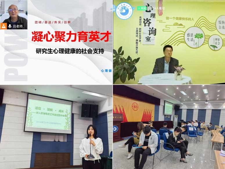 为积极响应“以心相伴、青春护航”为主题的第十七届5·25心理健康教育活动,全面构建校内协同育人机制,强化学生心理健康教育的全员参与意识,我校于5月13日—5月24日面向学院研究生导师及班主任、学生家长、近三年入职辅导员等不同群体,举办了三场心理健康培训讲座,分别邀请校心理健康中心吕彬江、张泰复、赵旋三位老师为主讲嘉宾,培训主题分别为“凝心聚力育英才——研究生心理健康的社会支持”“从调整“人生脚本”入手——有效能地做好大学生思想政治教育工作”“适应·赋能·成长——新入职辅导员工作适应团体辅导”。共计千余人聆听讲座。