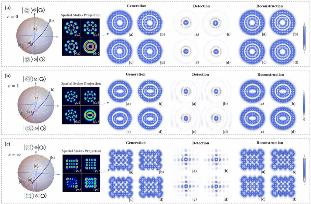 基于上述原理,研究团队设计、制备了一系列调控常见结构高斯SOC态的SGPG。实验表明(见图3)基于该元件的SOC互易接口一方面能够将标量偏振模式精确转换为高质量的目标SOC态(第一列),也可将产生的SOC态再次精确转换回能够高效耦合进单模光纤的标量偏振态(第二列)。此外,基于SOC投影测量结果理论重构出的光束矢量分布(第三列)与第一列中的实验产生结果高度一致,证明了SOC元件及系统的可靠性。本工作开启了基于平面光学的SOC光场空间结构全维度精确调控技术,为基于SOC态的高维经典及量子光场制备、调控及接口技术研究提供了重要支撑。