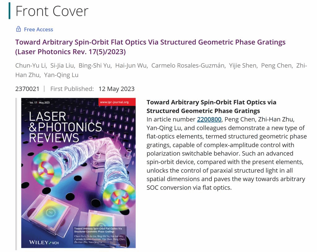 该研究工作于2023年2月8号以“Toward Arbitrary Spin-Orbit Flat Optics Via Structured Geometric Phase Gratings”为题在线发表在Laser & Photonics Reviews上(DOI:10.1002/lpor.202200800),并于5月12日作为第5期正封面印刷发表(Front Cover:10.1002/lpor.202370021)。我校测通学院省量子调控重点实验室为第一完成单位,仪器科学与技术学科2021级硕-博连读生李春宇(原物理系16级本科生及20级硕士研究生)与南京大学现代工学院2021直级博生刘思嘉为共同第一作者;测通学院朱智涵与南大现代工学院陈鹏、陆延青教授为共同通信作者。研究工作得到了国家自然科学基金、科技创新2030重大项目、江苏省前沿引领技术基础研究专项等资助。