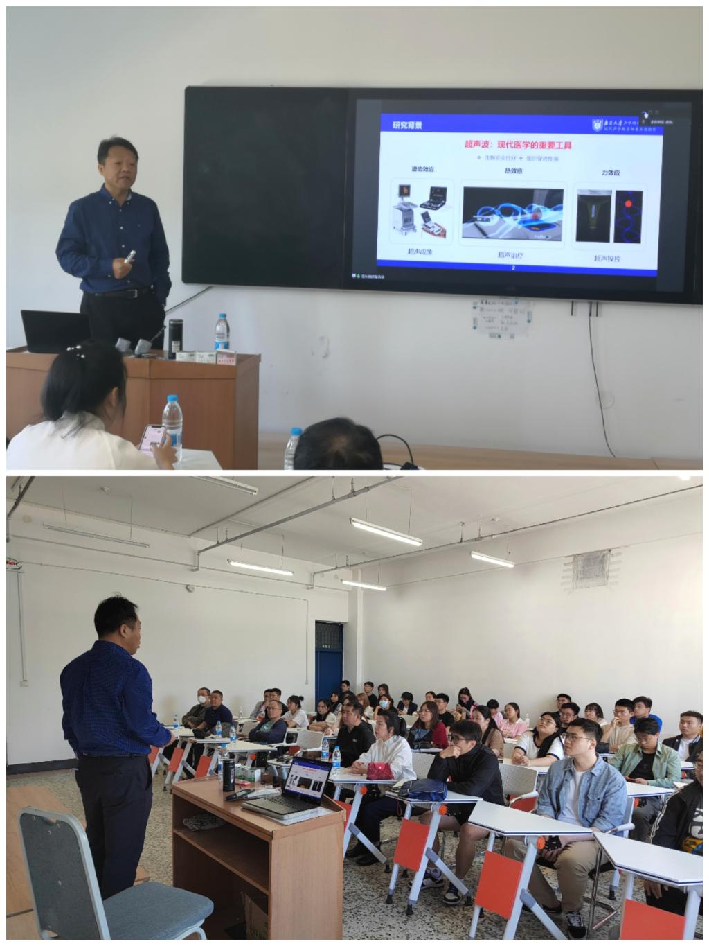 章东教授为物理学科师生作“热消融治疗中生物活体温度感知技术研究”的学术报告,报告由吴丰民教授主持。在报告中,章东教授给大家系统地介绍了超声波技术因其生物安全性好、组织穿透性强等特点成为现代医学的重要工具,而基于高强度聚焦超声(HIFU)的热消融是一种新兴的肿瘤微/无创治疗技术,有治疗多种重大疾病的潜力,但现有的测温手段很少有应用在临床活体热疗的监测中,成为活体超声治疗亟待解决的关键技术问题。报告中介绍了章东教授带领的南京大学医学超声团队与国内知名医疗机构联合开发的基于动态选帧-自适应滤波(DFS-AF)的热应变温度成像技术及基于呼/吸气分离的DFS-AF热应变温度成像技术,有效解决了活体治疗温度检测问题,在高强度聚焦超声热消融领域具有极高的应用前景。报告内容丰富、生动、深入浅出,对物理学科相关声学科研工作具有指导作用。