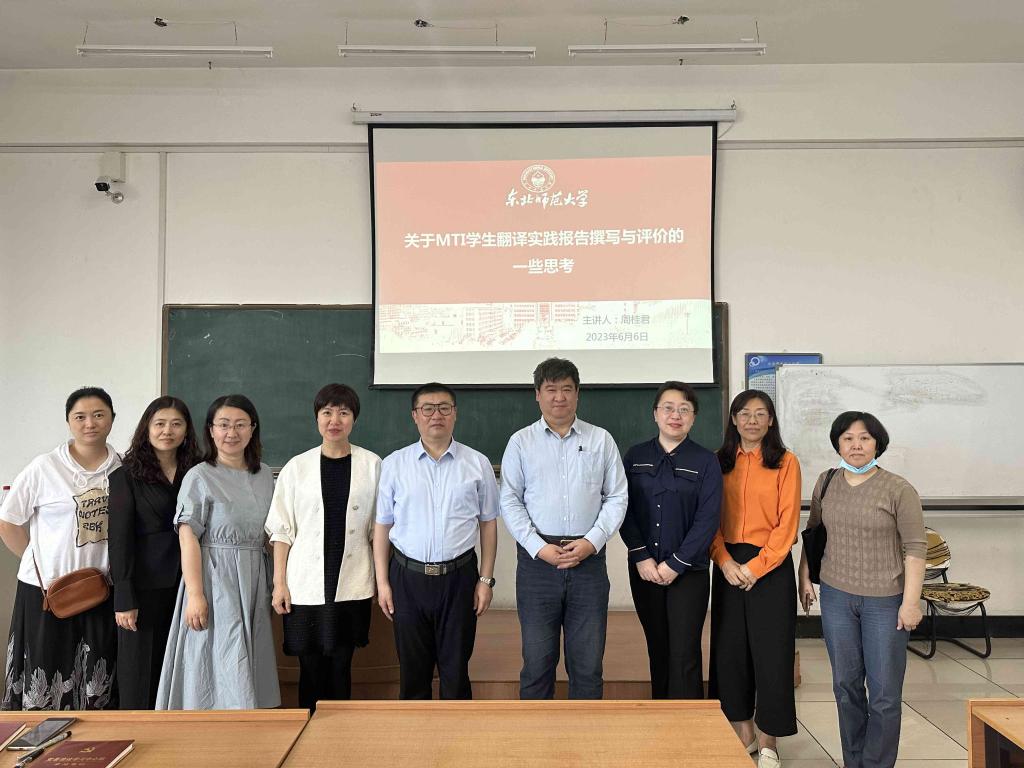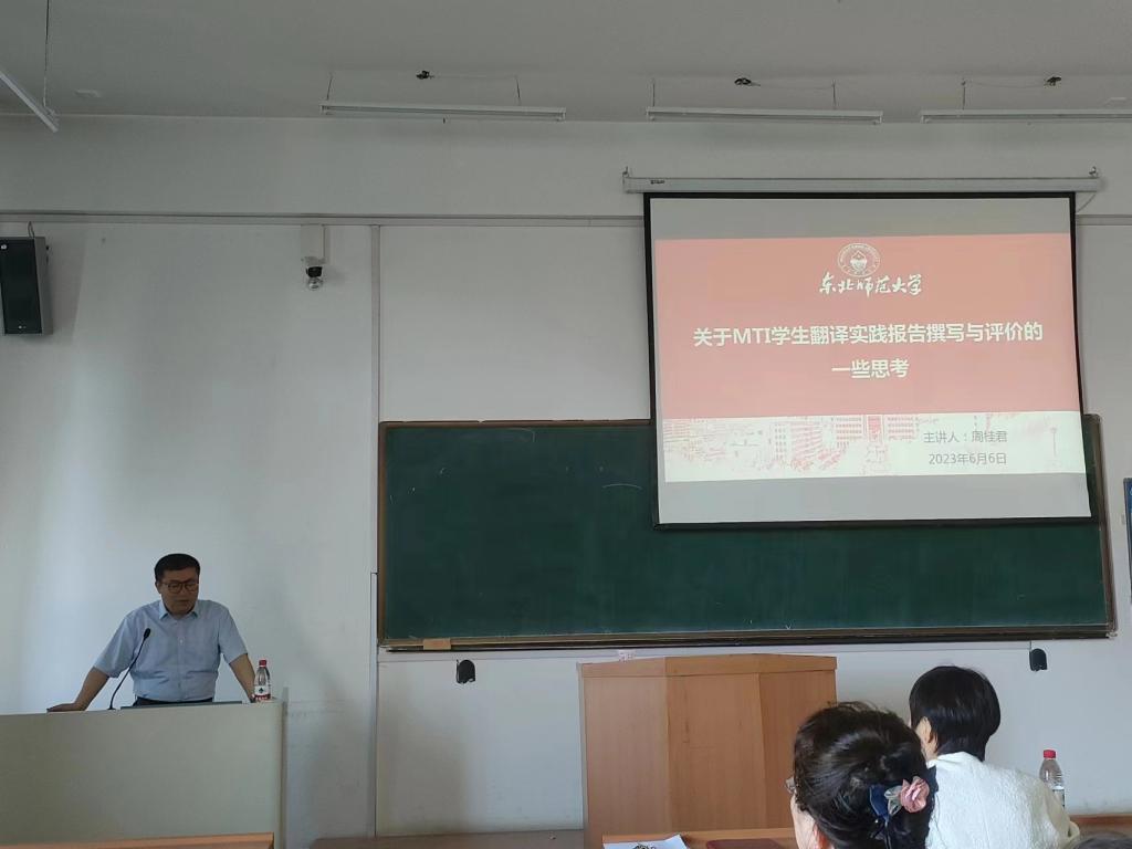 本次培训邀请全国翻译专业学位研究生教育指导委员会委员,东北师范大学外国语学院院长周桂君教授做题为《关于MTI学生翻译实践报告撰写与评价的一些思考》的讲座。周教授对当下翻译硕士翻译实践报告中存在的问题及原因进行深入剖析,对理论与实践的关系进行解读;结合东北师范大学翻译专业硕士人才培养的多年实践进行经验分享;并对我国翻译人才培养的前景与方向提出设想与展望。