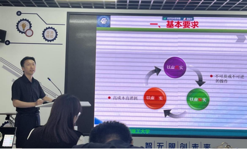 国家级第一批虚拟仿真实验教学一流本科课程《大型水轮发电机运行场景与运行特性虚拟仿真实验》负责人电气学院吕德刚老师,以《国家级虚拟仿真一流课程经验交流》为题,从申报基本要求、认定流程、课程建设、课程设计四个方面与参会教师进行经验交流。