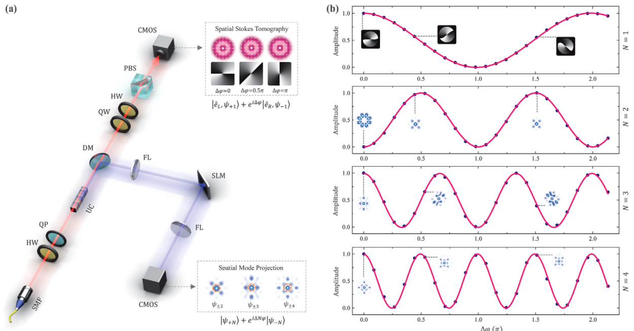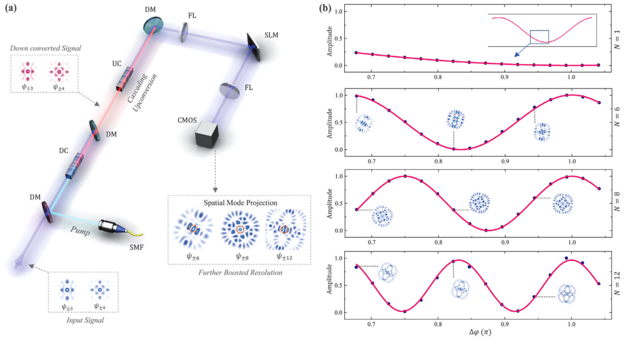 面向上述前沿问题,联合研究团队以前期物理研究成果(Phys. Rev. A 100, 053840;Phys. Rev. A 101, 063805)为基础另辟蹊径,提出实现全新的超分辨物理途径:利用轨道角动量(OAM)相干态在参量上转换过程中的模态结构演化模拟N00N态在SU(2)干涉仪中的光子数模态行为,进而得以更加高效的主动手段制备携带