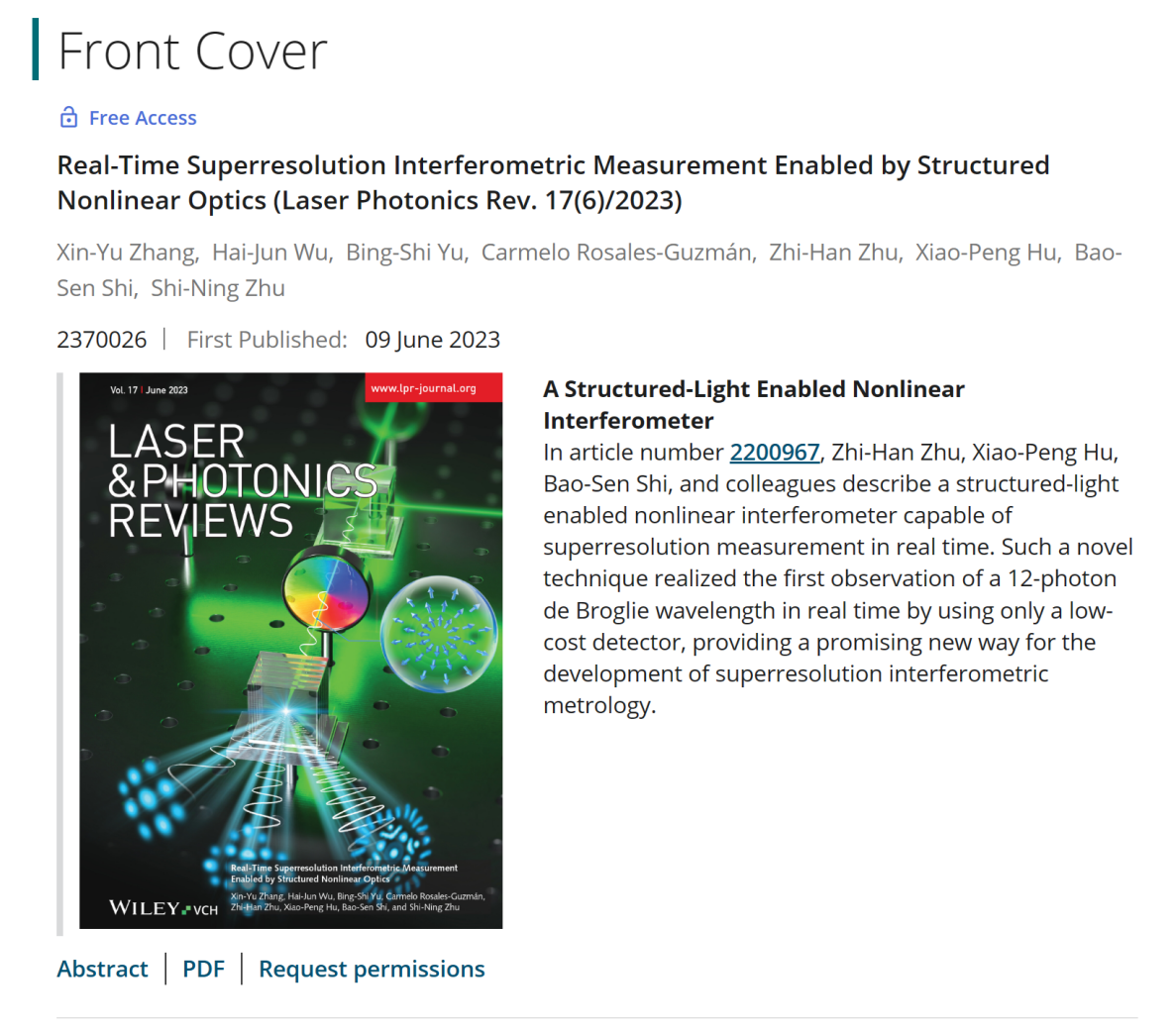 该研究工作于2023年3月19日以“Real-Time Superresolution Interferometric Measurement Enabled by Structured Nonlinear Optics”为题在线发表在Laser & Photonics Reviews上(DOI:10.1002/lpor.202200967),并于6月10日作为第6期正封面印刷发表(Front Cover: 10.1002/lpor.202370026)。我校测通学院省量子调控重点实验室大珩中心为第一完成单位;第一作者为原物理系2018级大珩班(由郭光灿院士推动建设的强基培养计划)本科生张鑫宇(现南京大学2022级直博生、导师为南京大学学术委员会主席祝世宁院士),此项研究为该生本科阶段的科研实训内容与毕业设计;哈尔滨理工大学朱智涵、南京大学胡小鹏与中国科学技术大学史保森教授为共同通信作者,祝世宁院士亦对本工作做出关键指导。该研究工作得到了国家自然科学基金、科技部“变革性技术关键科学问题”重点专项等资助。