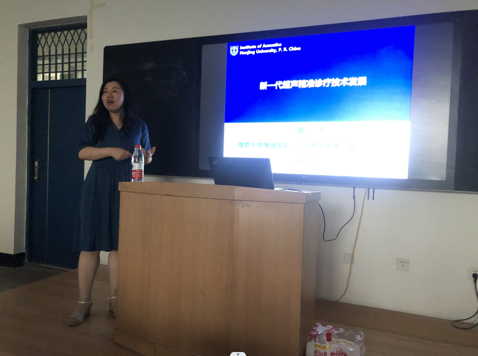 屠娟教授作了题为《新一代超声精准诊疗技术发展》的学术报告,报告介绍了医学超声因经济、无辐射可聚焦于生物组织深部等优点,在恶性肿瘤、神经调控、脑卒中等疾病的精准诊疗领域展现出重大研究价值和应用前景。近年来,结合纳米材料领域的创新性研究,超声造影剂微泡在临床诊疗得到广泛应用,促进了分子探针超声成像和靶向无创超声治疗技术的迅速发展。利用造影剂微泡的非线性特性,可获取特定细胞和分子生物过程的微观表征信息。同时,造影剂微泡作为空化核可显著降低生物组织中的空化阈值,高度聚集入射声能,形成高温、高压、射流、冲击波等极端物理条件,引发细胞膜声穿孔、局部组织升温等生物效应,增强超声治疗效果。然而,现有的影像引导下的超声治疗技术均采用诊/疗双探头分立方案,容易导致诊疗靶区失配,很难对微泡非线性响应和声空化行为进行有效调控,无法真正实现一体化精准诊疗。屠娟介绍了南京大学团队针对超声激励下包膜气泡动力学理论、生物效应、量效评价及其临床应用转化开展的系统性研究工作。详细介绍在上述基础上,团队深入理解微泡动力学作用机理,明确声空化相关生物效应的调控机制,并研制开发了收/发一体的超声诊疗设备,为成功实现安全、高效、精准可控的可视化超声诊疗团队做出的不懈努力。