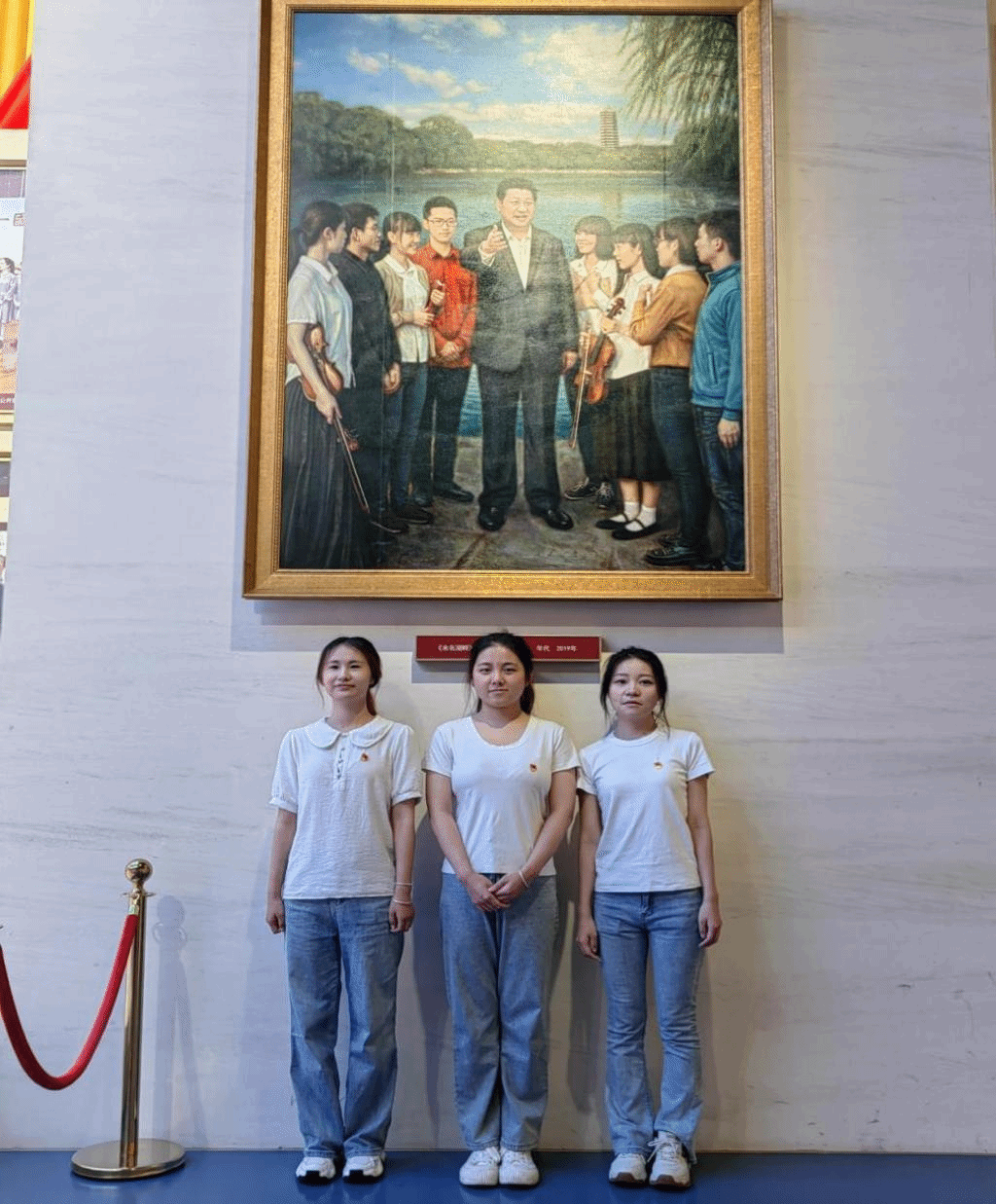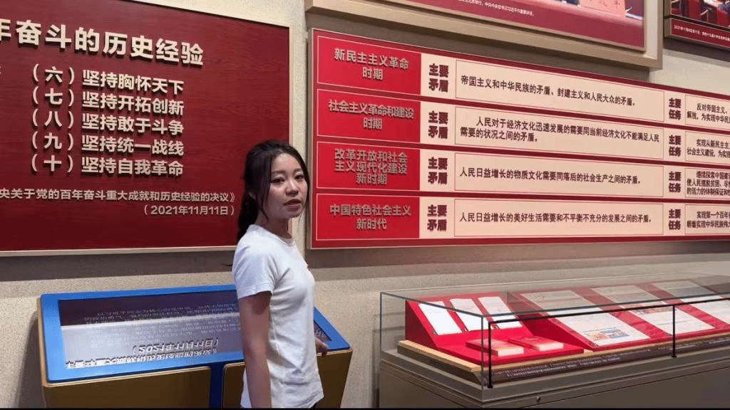 党的十八大以来,以习近平同志为核心的党中央高举中国特色社会主义伟大旗帜,奋力推进理论创新、实践创新、制度创新,推动党和国家事业取得全方位、开创性历史成就,发生深层次、根本性历史变革,中国特色社会主义进入新时代,中华民族迎来了从站起来、富起来到强起来的伟大飞跃。在中国共产党历史展览馆内,团队成员黄瑶讲述了同为水族青年的一大代表邓恩铭与二十大代表韦子涵的接力与传承,在历史与现实的贯通中诠释了中国共产党人为中国人民谋幸福、为中华民族谋复兴的初心与使命。