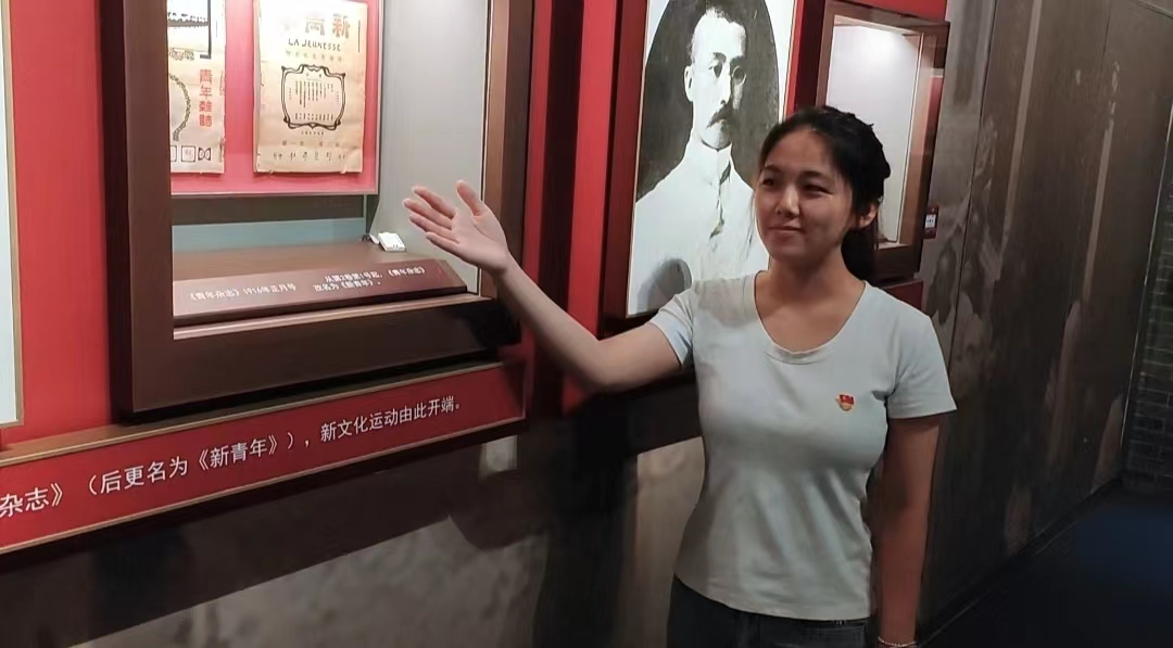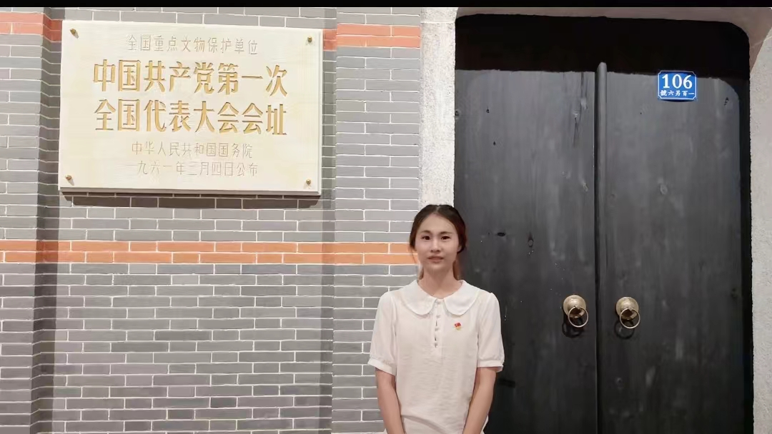 杨阳:8月15日,我有幸在中国共产党历史展览馆讲了一节别开生面的思政课,在党史展览馆里,我边看展区边回望历史,并向大家讲述了一群平均年龄只有28岁的建党新青年的伟大功绩,我与这群接受马克思主义思想指导的新青年产生了深入的灵魂交流。走过了中共一大召开地上海望志路106号的大门,来到了南湖的红船边,遇见了13名中共一大代表,穿越到了共产党创始人李大钊和革命志士赵世炎的身边,我边走边讲,仿佛置身于历史的长河中,在讲述的过程中,我对这群建党的新青年有了更深的了解和感悟,对他们的钦佩之情油然而生。这次行走的思政课让我受益匪浅,我从听课人变成了讲课人,从参观者变成了向导,有幸带领大家熟知这群建党新青年的故事,与1921的新青年进行了别有生趣的“对话”。