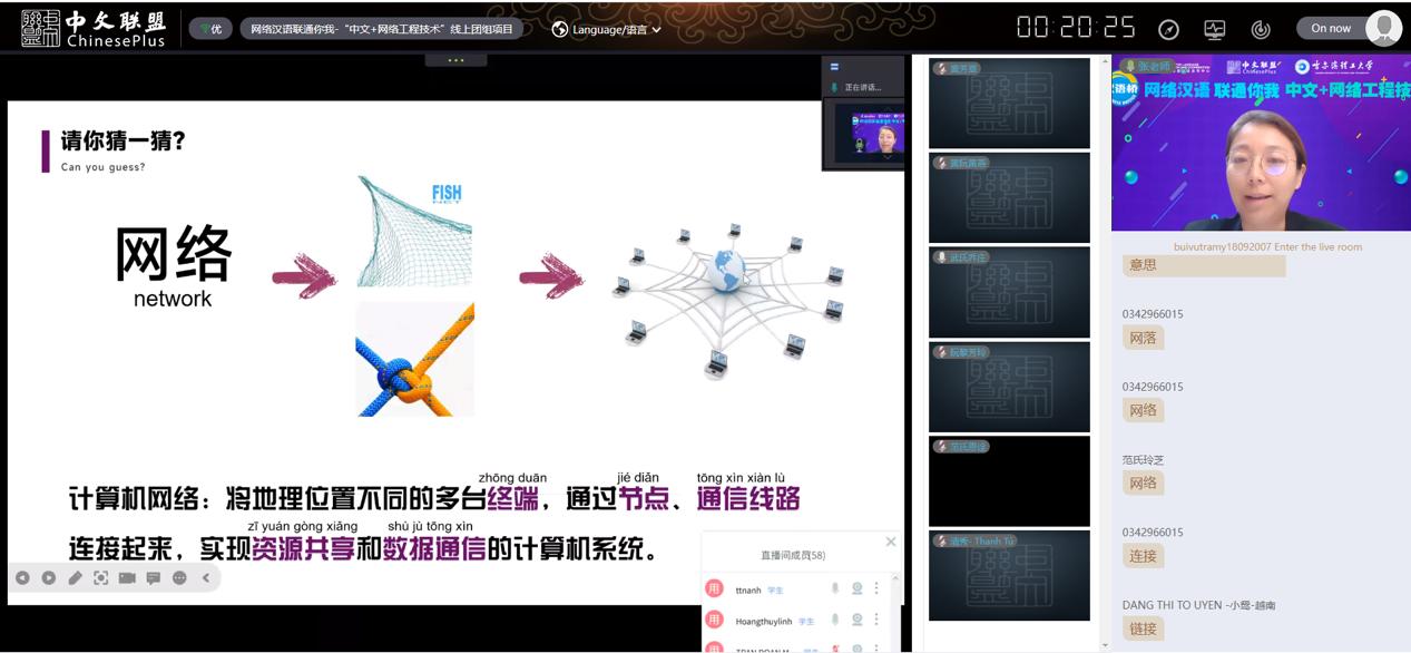 此次“汉语桥”线上团组项目分为直播课和录播课两部分,直播课又分为基础汉语课程和专业汉语课程。基础汉语课程以日常生活中的网络应用要素为支点,引领学员体验便利的网络生活;专业汉语课程以“网络汉语·联通你我”为主题,开设“中文+网络技术”特色课程,带领学员了解中国便捷网络生活背后的技术原理。录播课则是20个10-15分钟的网络知识视频,并指导学生通过模拟器搭建网络。文化体验课的重点是展示龙江科技,通过探访哈尔滨联通高鹏飞工作室、龙江数字体验中心、哈尔滨智慧城市大数据中心等线上体验活动,向境外同学展示龙江形象、传播龙江声音。