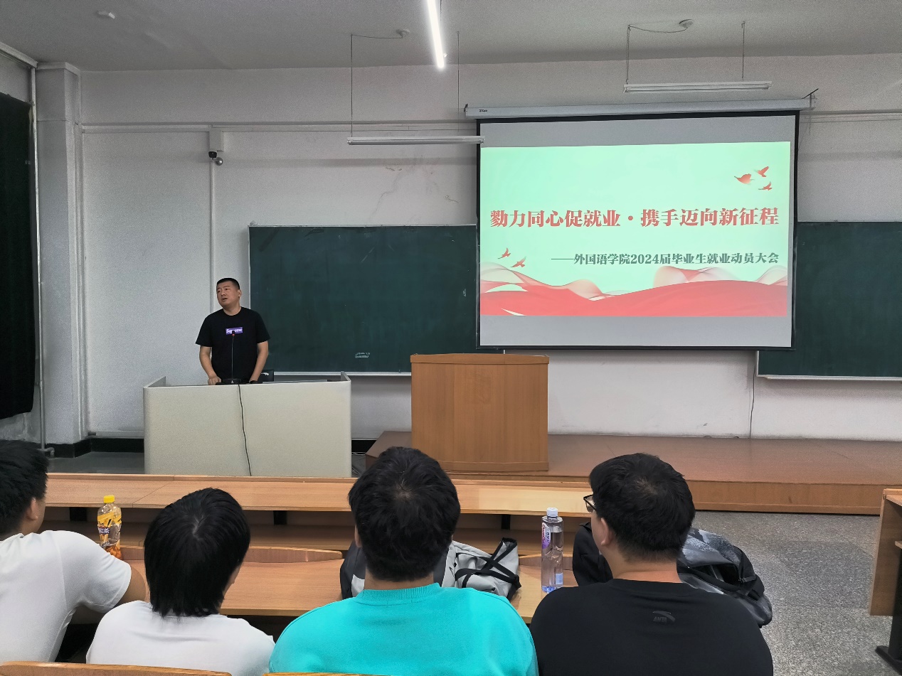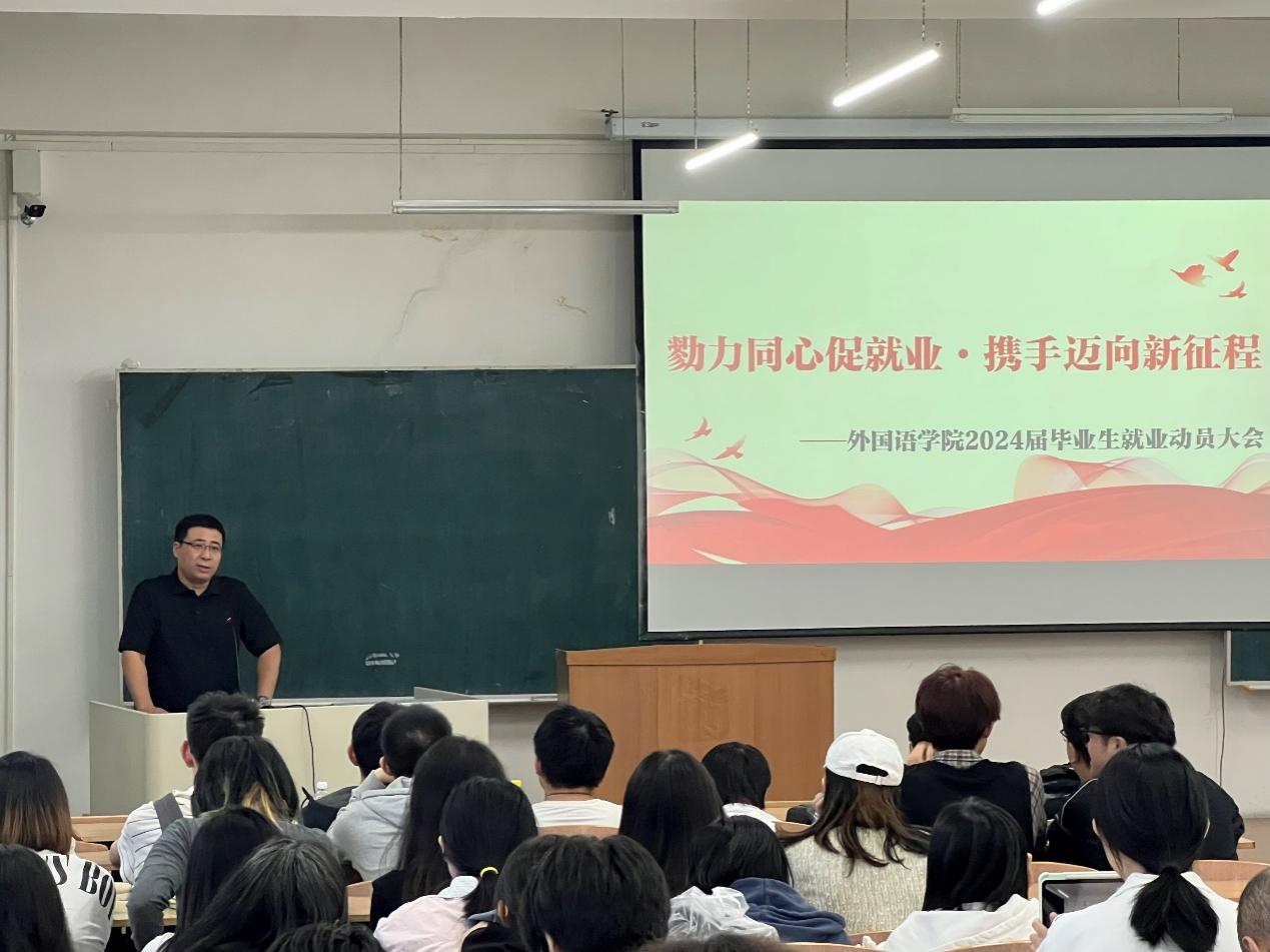 9月6日,外国语学院于南区1号楼536教室召开2024届毕业生就业动员大会。外国语学院党委副书记兼副院长蔡野、外国语学院就业干事马宁参加本次会议并作动员发言,外国语学院2024届全体毕业生参会,会议由2024届本科毕业生辅导员丁鑫博主持。