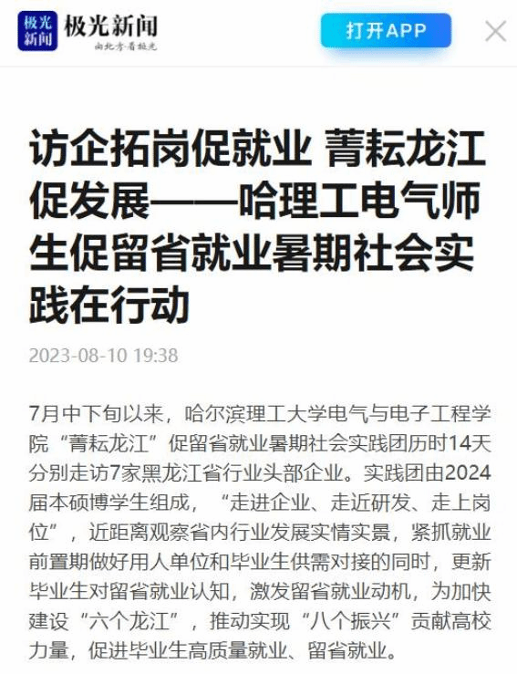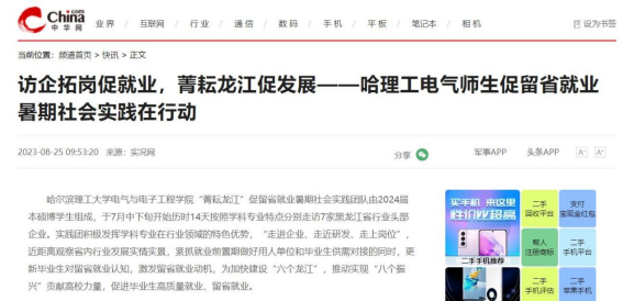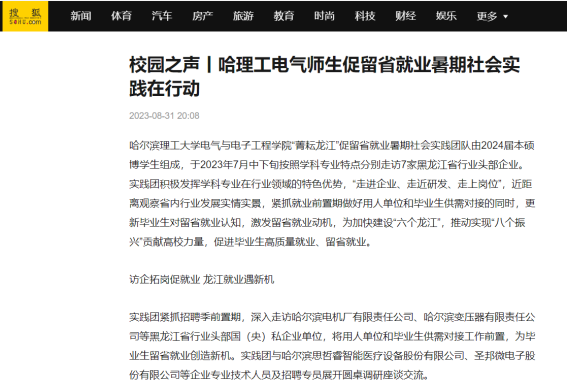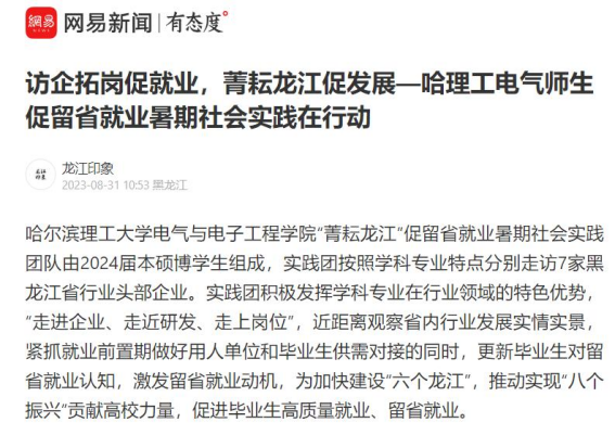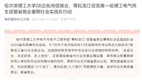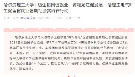 今年暑期,哈尔滨理工大学电气与电子工程学院“菁耘龙江”促留省就业暑期社会实践团队在东北振兴战略实施20周年之际,锚定振兴东北实践目标,嵌入战略支撑实践路径,强化科技创新推动产业创新实践情怀,激发留省就业实践信心,于7月中下旬开始历时14天按照学科专业特点分别走访7家黑龙江省行业头部企业进行访企拓岗、就业指导座谈交流、留省就业意向调研、主题教育理论宣讲及交流学习等实践内容。通过“走进企业、走近研发、走上岗位”,近距离观察省内行业发展实情实景,紧抓就业前置期做好用人单位和毕业生供需对接的同时,更新毕业生对留省就业认知,激发留省就业动机,为加快建设“六个龙江”,推动实现“八个振兴”贡献高校力量,促进毕业生高质量就业、留省就业。此次活动被人民日报、中国日报网、中国网、中青校园、中华网、极光新闻、网易新闻、黑龙江高校就业要情、黑龙江学联等25个媒体报道,共发表新闻宣传稿件达120余篇,总浏览量达10W+。