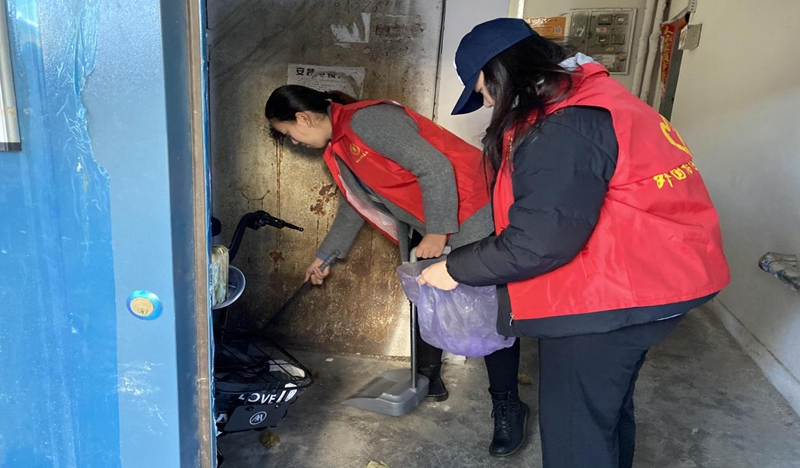 党员志愿者在打扫卫生
