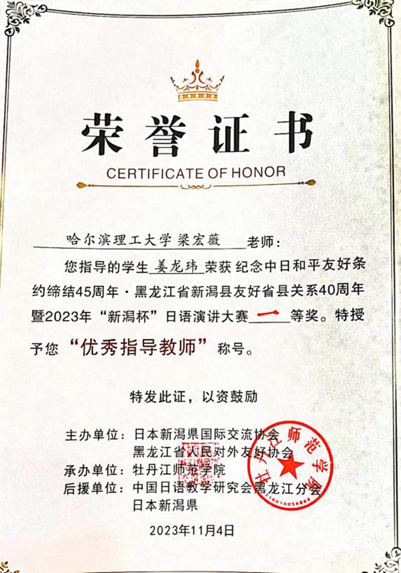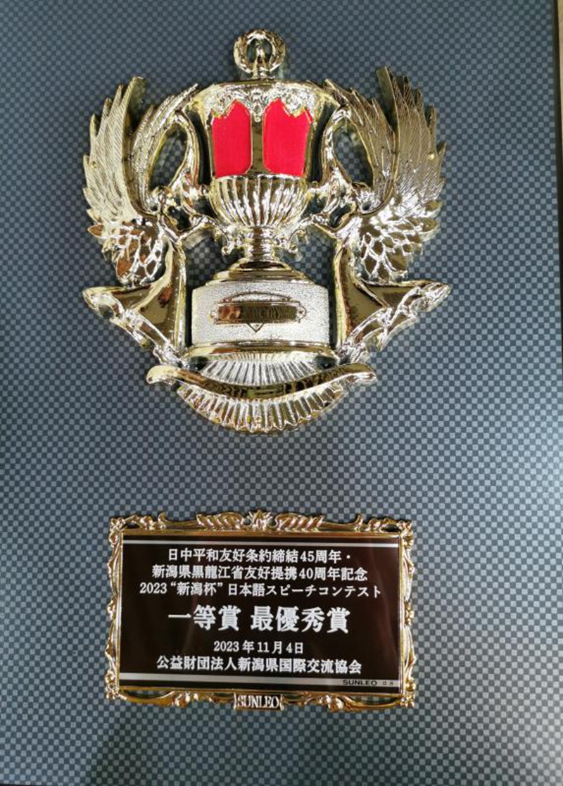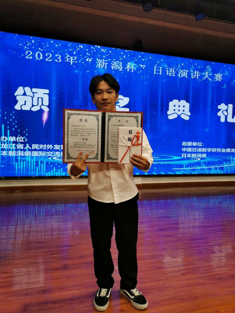 2023年“新潟杯”日语演讲大赛于11月4日在牡丹江师范学院举行。我校参赛选手、日语系21级姜龙玮同学在比赛中表现出色,荣获一等奖,受到日本新潟県国际交流协会出资邀请赴日游学一周。外国语学院梁宏薇老师指导并带队参加本次比赛,荣获“优秀指导教师”称号。