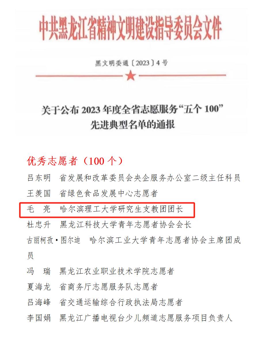 近日,由中共黑龙江省精神文明建设指导委员会组织评选的2023年度黑龙江省志愿服务“五个100”先进典型名单发布,其中,我校研究生支教团成员毛亮被推选为“优秀志愿者”。