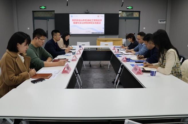 王卫副院长代表学院对王家明副院长一行表示欢迎,并从学科体系、学位点布局、专业设置等几个方面介绍了学院发展的基本情况。王家明副院长对我院表示了感谢,并逐一介绍了山东石油化工学院的发展历程及优势特色、经济管理与文法学院专业构成、师资队伍、培养规模、教学科研成果产出等情况,以及学院发展在师资队伍及学科专业建设方面面临的困境。进一步,王家明副院长表达了欢迎我院培养的优秀博士生到山东石油化工学院发展的意愿,并详细介绍了招聘岗位及人才待遇。最后,王家明副院长希望两院就学科发展、科研平台及实验室建设等方面做进一步的沟通交流。