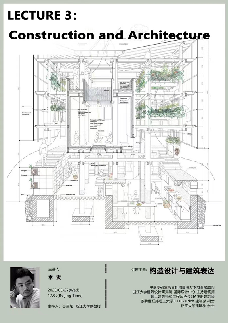 系列课程第二讲于3月14日下午16:00—17:30成功举办。浙江大学吴津东副教授主持了讲座,主讲人为李寅老师。李寅老师以“零碳建筑设计概览—瑞士与中国建筑实例”为主题,从零碳建筑基础知识、建筑隐含碳排放和材料选择以及典型零碳建筑案例等方面为学生做了精彩分享。