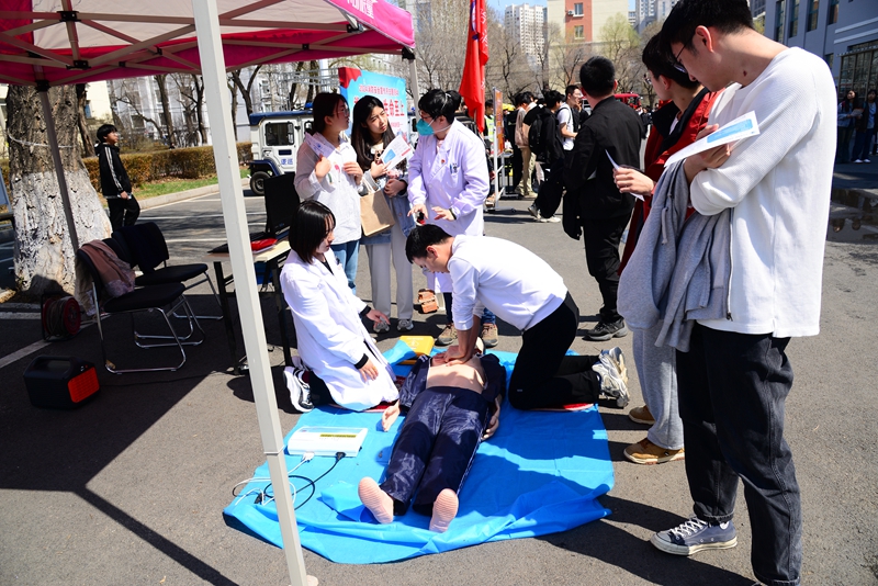 校医院现场讲解发生火灾时医疗救护方面的知识并模拟演示,以及心肺复苏(cpr)和外伤包扎的相关操作常识。