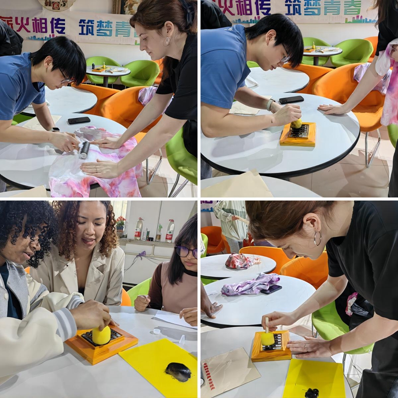 留学生们通过选字、精心排版、巧妙刷墨、细致拓印等一系列工序,深入体验了活字印刷这一古老技艺所散发出的独特魅力和深厚文化底蕴。他们不断尝试调整排版顺序,精细控制刷墨的浓度,以及恰到好处地掌握拓印的力度,将“国际中文日”的标识或古诗词巧妙地印在宣纸上,甚至创新地印在了色彩斑斓的扎染T恤上。每一件作品都是他们匠心独运的结晶,都承载了他们对中文文化的热爱和敬仰。