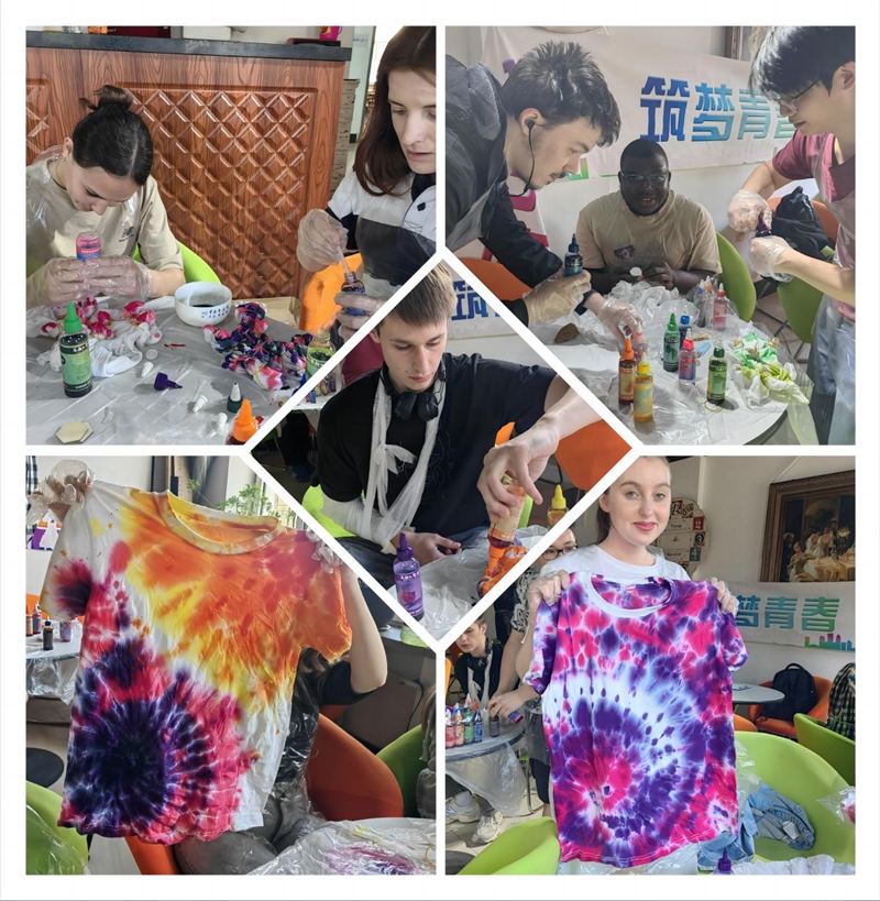 4月17日下午,张明明老师从扎染的源起、历史演变、艺术价值、制作流程、常见技法,至其国际传播与影响,为留学生们进行全面而深入的讲解,引发出他们对这一传统技艺的浓厚兴趣。“五折法”、“云染”、“塔扎”等这些对于留学生初次听到词语,在老师的亲切指导下,于实践环节中得以生动展现。尽管留学生们在操作上尚显生疏,但这并未减退他们对探究中华文化艺术的热情。在老师的悉心帮助下,每个人都全情投入,历经设计、折叠、扎结、脱浆、染色、清洗等一系列步骤,经过“漫长”的制作与等待,留学生们亲手创作的扎染作品终于揭开了神秘的面纱:一件件T恤上绽放出独特的花朵。