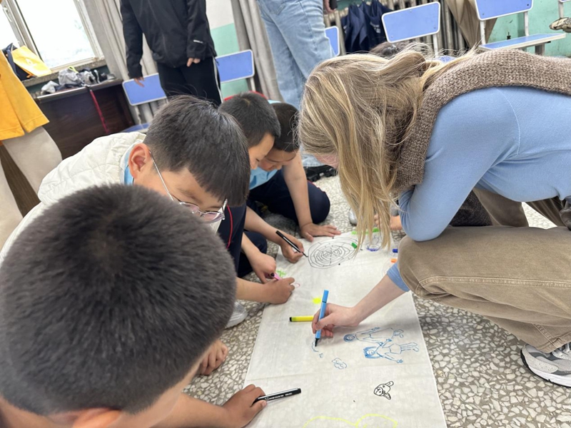 留学生们和孩子们一起画画,他们用彩笔描绘出五彩斑斓的童话世界,让孩子们在绘画中发挥自己的想象力,感受艺术的魅力。留学生们还教孩子们学英语,让他们在轻松愉快的氛围中学习英语,开拓视野,增长见识。