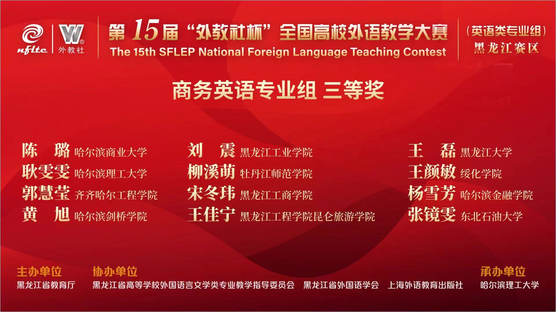6月1日,在第十五届“外教社杯”全国高校外语教学大赛(商务英语专业组)黑龙江赛区决赛中,荣成学院外语系教师耿雯雯获全国高校外语教学大赛黑龙江赛区决赛商务英语专业组三等奖。