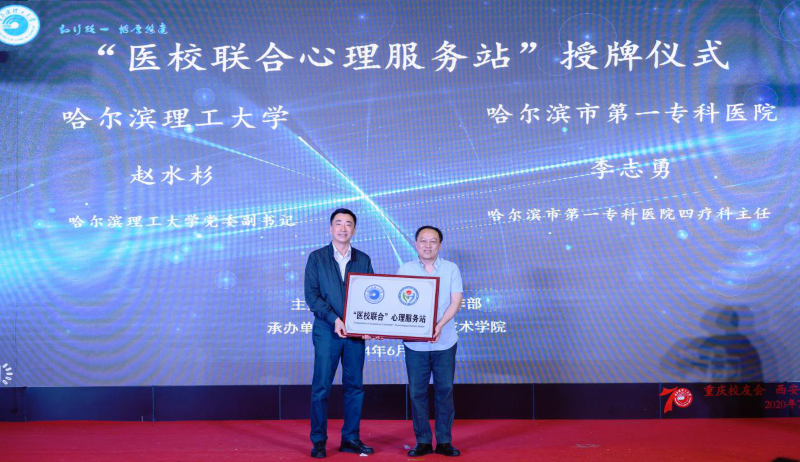 活动伊始,学校党委副书记赵水杉为哈尔滨市第一专科医院四疗科主任李志勇进行“医校联合心理服务站”授牌仪式。此次医校合作共建,充分整合医疗机构的优势资源和学校心理健康教育育人功能,促进学校与社会协同育人机制,对及时有效转介、诊疗心理问题学生具有重要意义。