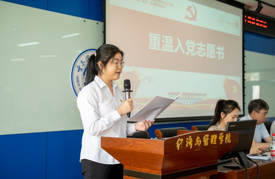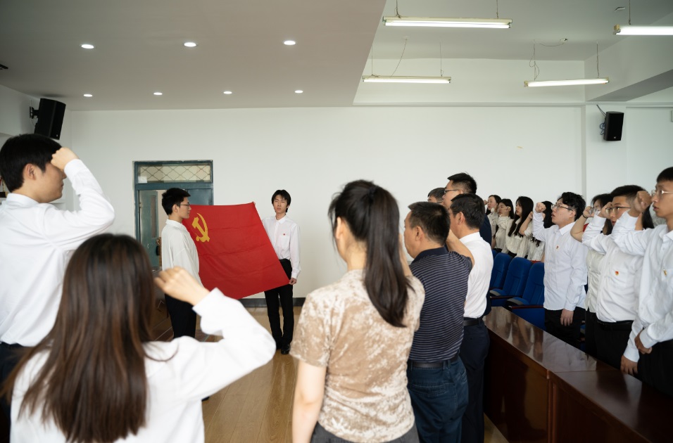 接下来,毕业生党员代表曲昀佳宣读了个人入党志愿书,分享了自己的入党谈话经历。通过重温入党志愿书和入党谈话,全体毕业生党员表示,离开学校后会一如既往地坚定理想信念,高举信仰旗帜,常思入党初心,做到初心不改、践诺一生,无愧于共产党员的光荣称号。随后,在毕业生党员代表吴晓鹏的领誓下,现场全体党员面向党旗,举起右手,紧握成拳,庄严宣誓。重温誓词结束后,学院领导及毕业班辅导员老师为毕业生党员代表胡中冠、张玲宵、马宏达、张辉、田韵新、李岳彤,发放“党员提示卡”。一张张鲜红的“党员提示卡”承载了学院对毕业生党员的殷切嘱托,希望他们严格要求自己、做好表率,让青春之花在祖国大地上绚丽绽放。