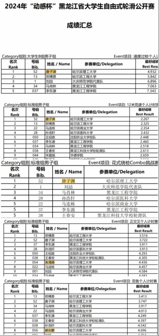本届轮滑公开赛吸引了14所高校的一百多名运动员和轮滑爱好者参加。哈尔滨理工大学派出了由体育教学部副主任孙树滨担任领队,郑茂成老师担任教练,7名运动员组成的代表队。整个赛场充满了激情和活力,选手们都以高昂的斗志和健康向上的精神风貌迎接接下来的精彩赛事。经过两天激烈角逐,最终唐子渊同学获得速度过桩个人计时赛、12米竞速个人计时赛、花式绕桩Combo挑战赛三个项目的冠军,他还获得了花式绕桩、障碍个人计时赛、正交叉个人计时赛、双鱼个人计时赛亚军以及即兴花式绕桩、跳高季军。张清源同学获得正交叉个人计时赛项目第7名;郝志鹏同学获得双鱼个人计时赛项目第8名。唐子渊同学一个人就获得了9项前三名,这几位同学的精彩表现为学校争得了荣誉,也为自己的青春年华留下了浓墨重彩的一笔!