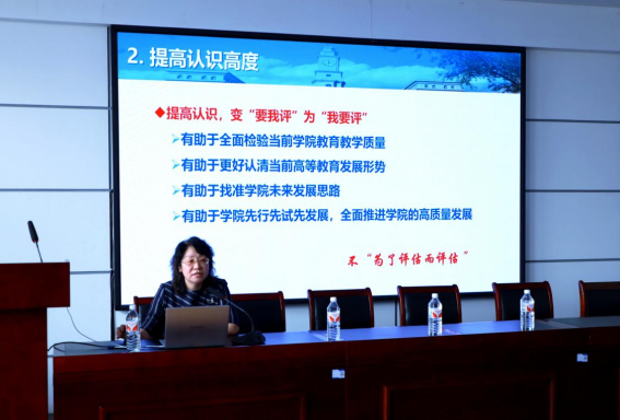 李英梅副院长以《本科教育教学审核评估——学院评建工作要点》为题,从新一轮审核评估的精髓要义、务实高效开展学院自评自建工作、审核评估过程与注意事项等三个方面进行详细阐述。报告指出要深刻理解落实立德树人根本任务,学院层面要建立审核评估工作组织机构、明确任务分工,广大师生要提高参与本科教育教学审核评估工作的自觉意识和端正态度。最后在高质量撰写自评报告/特色案例材料、高效梳理教学材料等方面做了精彩经验分享。