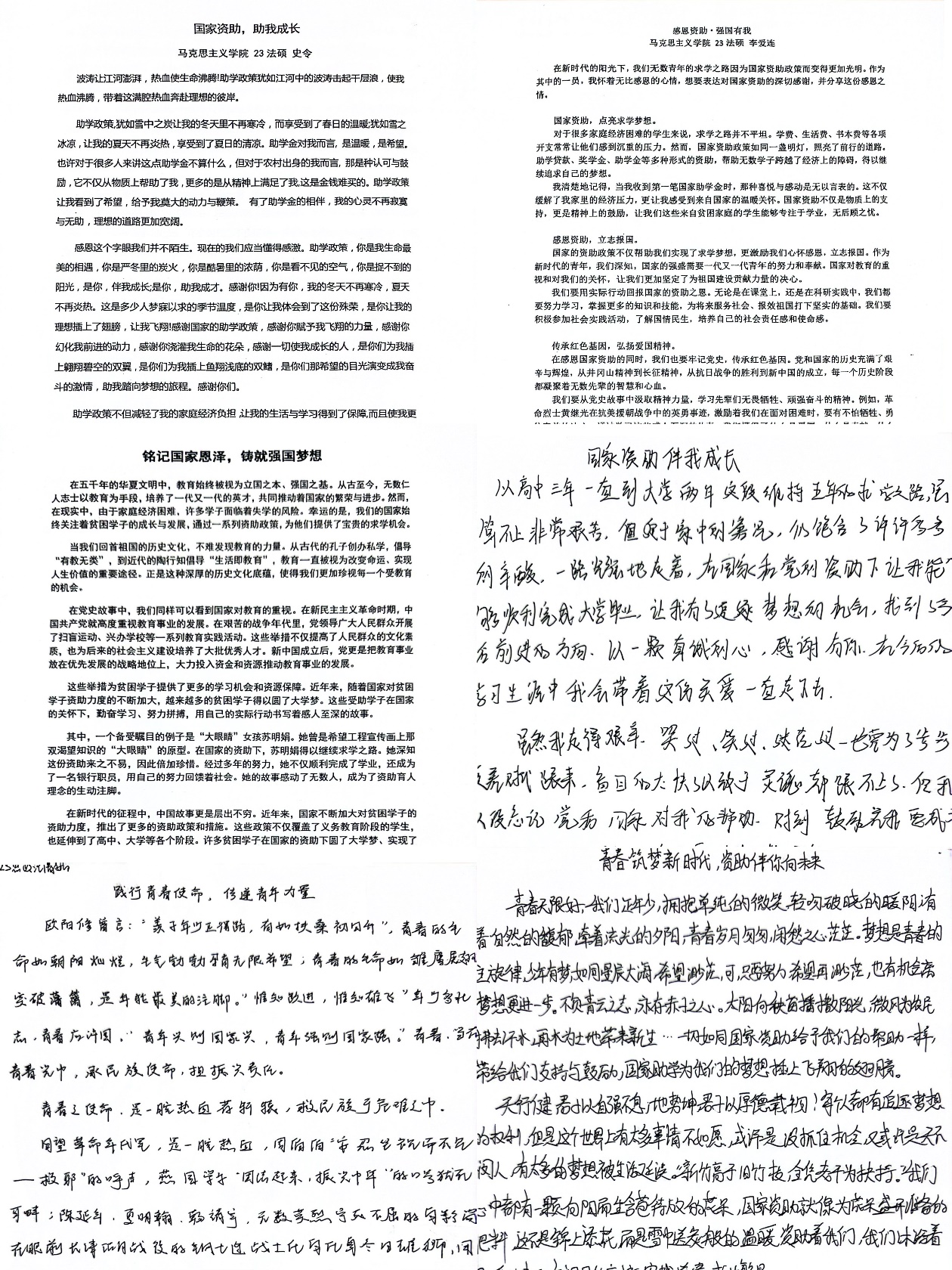 学校立足资助育人理念,结合祖国历史文化、党史故事、中国故事,组织在国家资助下实现求学梦想的广大受助学生开展爱国主义教育活动、征文比赛等,弘扬社会主义核心价值观,激发学生感恩国家资助,砥砺强国之志,立志以实际行动助力祖国建设的坚定信念;从爱国主义教育中汲取补足精神之钙,将爱国主义内化于心,外化于行,以实际行动宣传、践行爱国主义,成为爱国主义教育的时代推动者,担当时代责任,勇于拼搏奋斗,为实现中华民族伟大复兴的中国梦贡献青春力量。