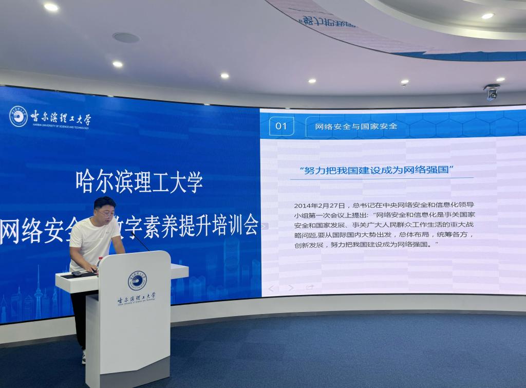 为深入学习贯彻习近平总书记关于网络强国的重要思想,全面普及网络安全和数字素养知识,增强学校网络安全管理和服务保障能力,切实提升学校各单位网络安全意识与防范能力,确保学校网络安全,6月25日下午,学校在教学主楼智慧校园一体化空间(D507)召开了网络安全和数字素养提升专题培训会。网络信息中心副主任王志强及中心各部门负责人,学校各单位网络信息员40余人参加了会议,荣成学院网络信息员线上参会。会议由网络信息中心安全部部长孙宗宝主持。