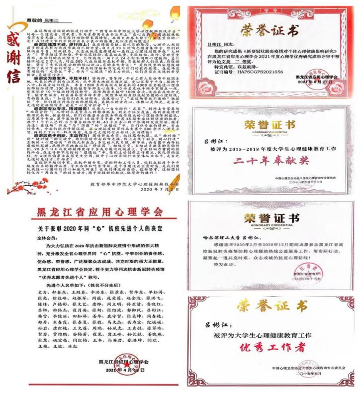 近年来,心理专兼职教师多次获得教育部、黑龙江省教育厅等组织的科研立项,出版专著多部,有数十篇论文发表于核心刊物;指导第十八届“挑战杯”全国大学生课外学术科技作品竞赛获全国三等奖;获黑龙江省第六届青年教师教学竞赛二等奖;3项心理危机干预案例入选省优秀案例选编并推广宣传。心理教研室主任吕彬江获全国大学生“心理健康教育工作先进个人”、全国大学生“心理健康教育二十年奉献奖”;4名兼职心理咨询师获评黑龙江省“最美高校辅导员”等荣誉称号。我校教师积极参加抗击新冠肺炎疫情心理服务,获教育部心理服务平台和黑龙江省教育厅、黑龙江省应用心理学学会的表彰,取得良好的社会反响。